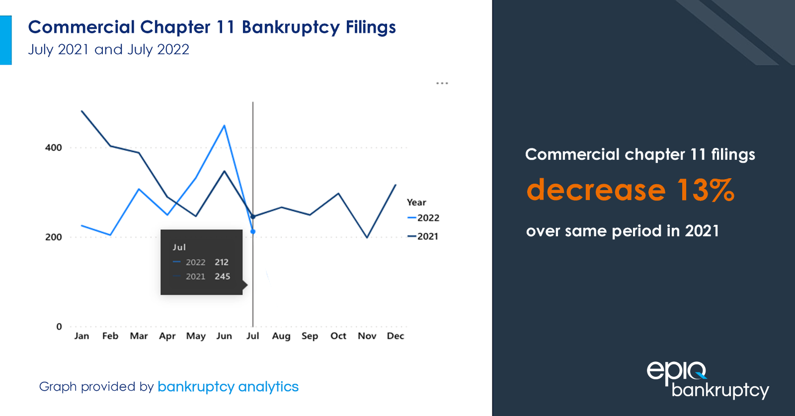 NEW YORK — AUGUST 3, 2022 — There were 212 commercial chapter 11 filings registered in July 2022, a decrease of 13 percent from the 245 filings in July 2021, according to data provided by Epiq Bankruptcy, the leading provider of U.S. bankruptcy filing data.