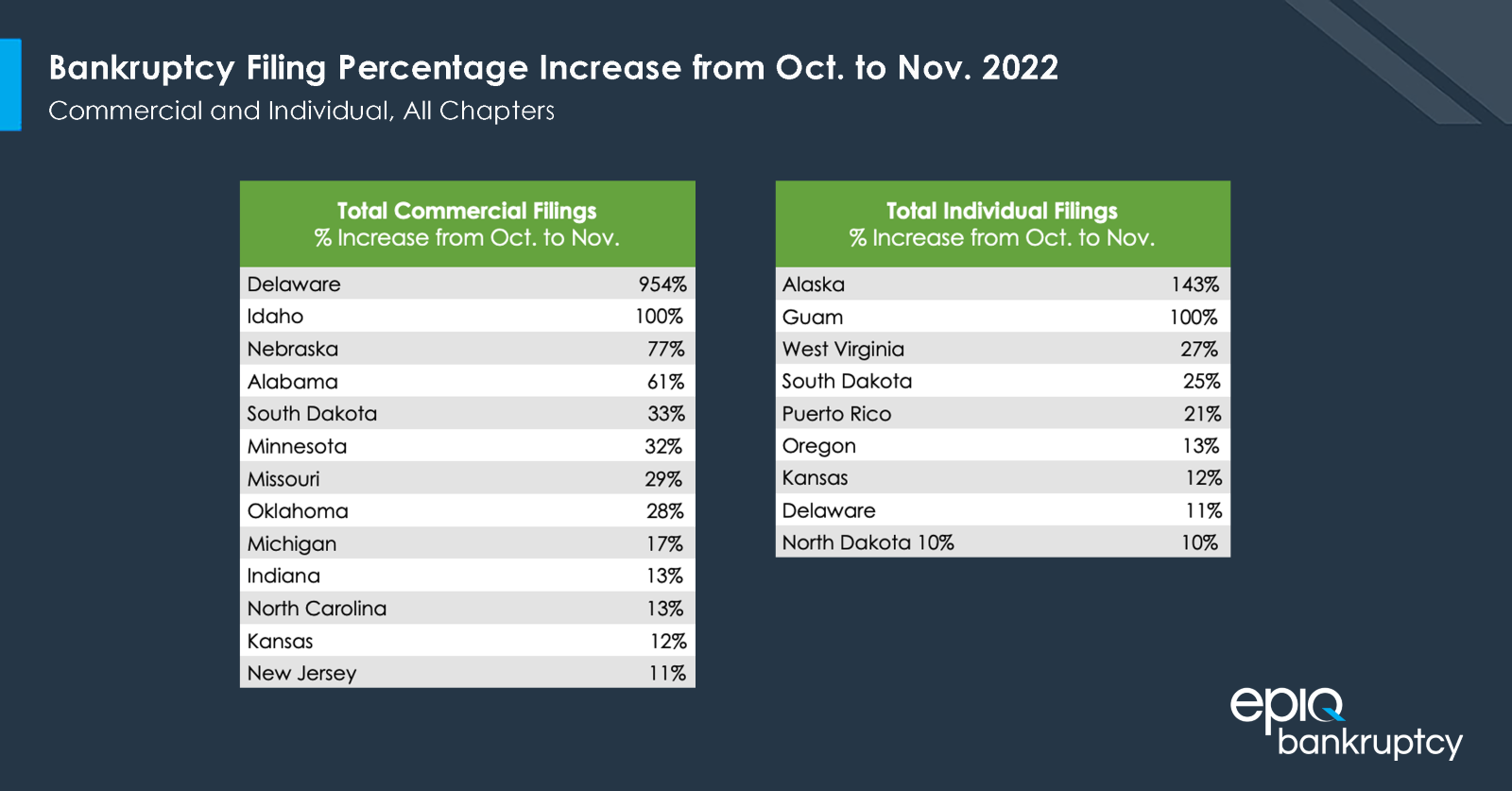 States with the highest percentage increases in commercial filings included DE, ID, NE, AL, SD, MN, MS, OK, MI, IN, NC, KS and NJ. States with the most individual filings percentage increases were AK, WV, SD, OR, KS, DE and ND.