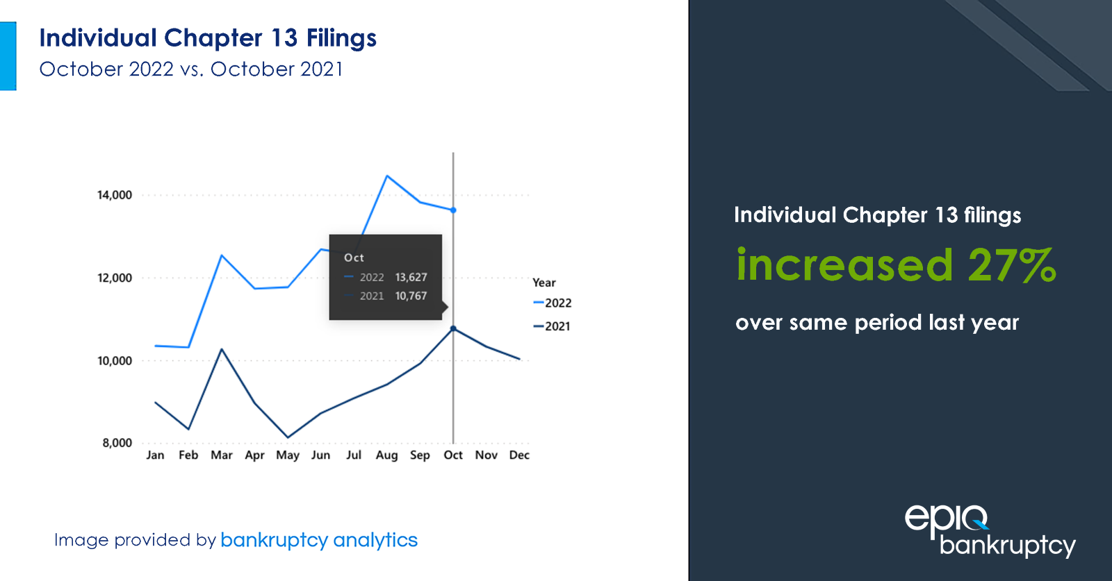 NEW YORK – Nov. 3, 2022 – Individual chapter 13 filings increased 27 percent to 13,627 in October 2022 from 10,767 filings in October 2021, according to data provided by Epiq Bankruptcy, the leading provider of U.S. bankruptcy filing data. Total bankruptcy filings in the United States increased four percent to 32,695 in October 2022 over the 31,493 total filings in October 2021.