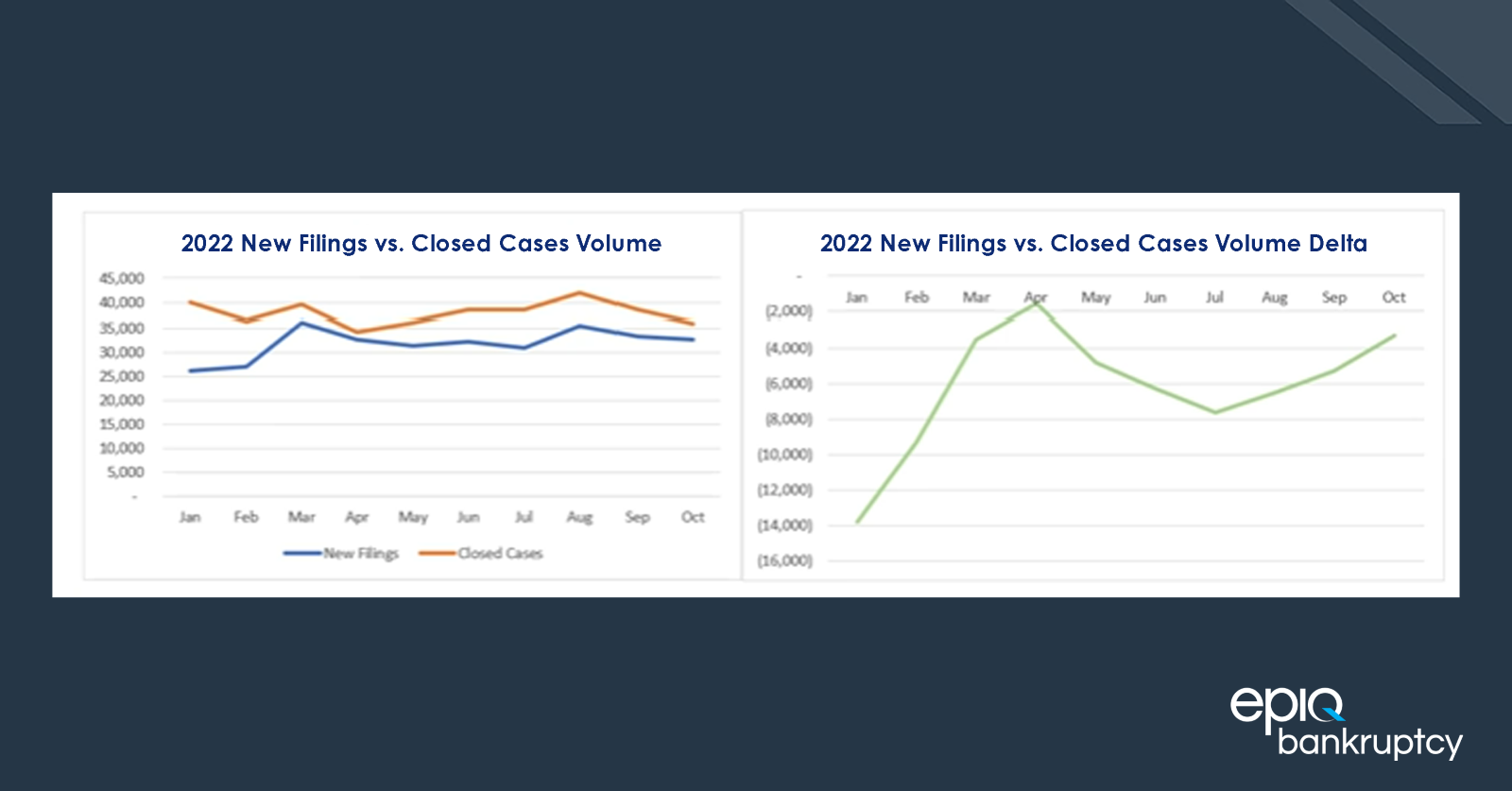 “While comparing month-over-month or year-over-year filings is one way to determine what's trending in the bankruptcy market, the delta between new filings and closed cases is another valuable capacity metric,” said Gregg Morin, Vice President of Business Development and Revenue at Epiq Bankruptcy.